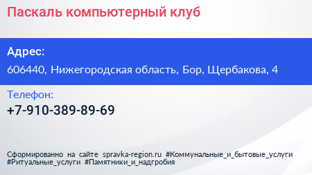 Паскаль, компьютерный клуб по адресу 606440, Нижегородская область, Бор, Щербакова, 4 в дальнейшем Организация, размещена в следующих категориях: