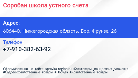 Соробан, школа устного счета по адресу 606440, Нижегородская область, Бор, Фрунзе, 26 в дальнейшем Организация, размещена в следующих категориях: