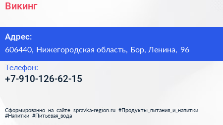Викинг по адресу 606440, Нижегородская область, Бор, Ленина, 96 в дальнейшем Организация, размещена в следующих категориях: