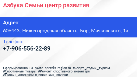 Азбука Семьи, центр развития по адресу 606443, Нижегородская область, Бор, Маяковского, 1а в дальнейшем Организация, размещена в следующих категориях: