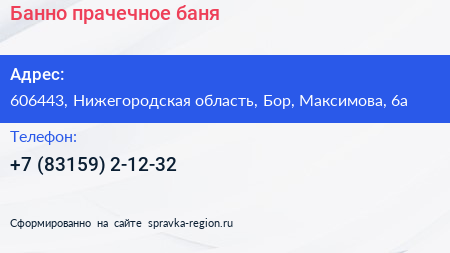 Банно-прачечное, баня по адресу 606443, Нижегородская область, Бор, Максимова, 6а в дальнейшем Организация, размещена в следующих категориях: