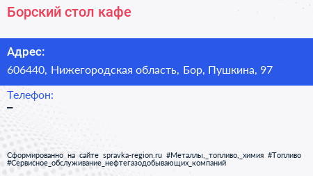Борский стол, кафе по адресу 606440, Нижегородская область, Бор, Пушкина, 97 в дальнейшем Организация, размещена в следующих категориях: