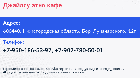 Джайляу, этно-кафе по адресу 606440, Нижегородская область, Бор, Луначарского, 12г в дальнейшем Организация, размещена в следующих категориях: