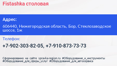 Fistashka, столовая по адресу 606440, Нижегородская область, Бор, Стеклозаводское шоссе, 1ж в дальнейшем Организация, размещена в следующих категориях: