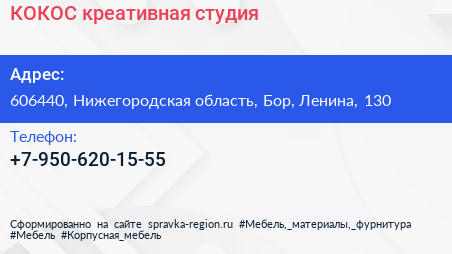 КОКОС, креативная студия по адресу 606440, Нижегородская область, Бор, Ленина, 130 в дальнейшем Организация, размещена в следующих категориях: