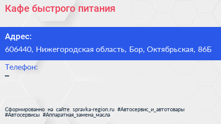 Кафе быстрого питания по адресу 606440, Нижегородская область, Бор, Октябрьская, 86Б в дальнейшем Организация, размещена в следующих категориях: