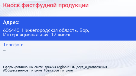 Киоск фастфудной продукции по адресу 606440, Нижегородская область, Бор, Интернациональная, 17 киоск в дальнейшем Организация, размещена в следующих категориях: