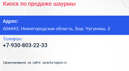 Киоск по продаже шаурмы по адресу 606443, Нижегородская область, Бор, Чугунова, 2 в дальнейшем Организация, размещена в следующих категориях: