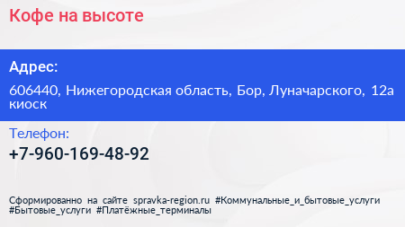 Кофе на высоте по адресу 606440, Нижегородская область, Бор, Луначарского, 12а киоск в дальнейшем Организация, размещена в следующих категориях: