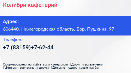 Колибри, кафетерий по адресу 606440, Нижегородская область, Бор, Пушкина, 97 в дальнейшем Организация, размещена в следующих категориях:
