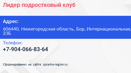 Лидер, подростковый клуб по адресу 606440, Нижегородская область, Бор, Интернациональная, 23Б в дальнейшем Организация, размещена в следующих категориях: