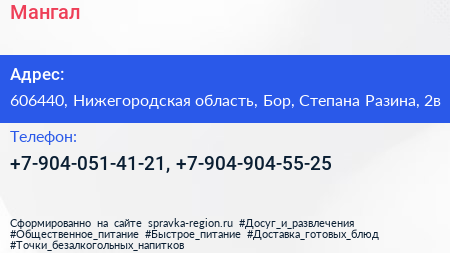 Мангал по адресу 606440, Нижегородская область, Бор, Степана Разина, 2в в дальнейшем Организация, размещена в следующих категориях:
