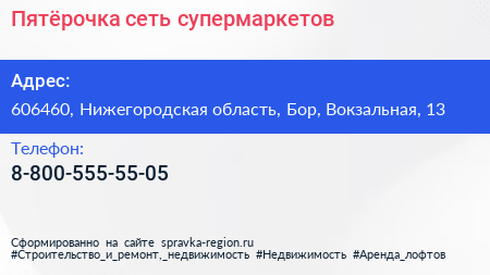 Пятёрочка, сеть супермаркетов по адресу 606460, Нижегородская область, Бор, Вокзальная, 13 в дальнейшем Организация, размещена в следующих категориях: