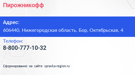 Пирожникофф по адресу 606440, Нижегородская область, Бор, Октябрьская, 4 в дальнейшем Организация, размещена в следующих категориях: