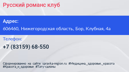 Русский романс, клуб по адресу 606460, Нижегородская область, Бор, Клубная, 4а в дальнейшем Организация, размещена в следующих категориях: