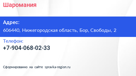 Шаромания по адресу 606440, Нижегородская область, Бор, Свободы, 2 в дальнейшем Организация, размещена в следующих категориях: