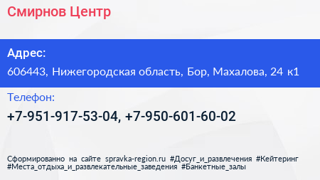 Смирнов Центр по адресу 606443, Нижегородская область, Бор, Махалова, 24 к1 в дальнейшем Организация, размещена в следующих категориях: