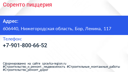 Соренто, пиццерия по адресу 606440, Нижегородская область, Бор, Ленина, 117 в дальнейшем Организация, размещена в следующих категориях: