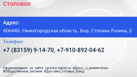 Столовая по адресу 606440, Нижегородская область, Бор, Степана Разина, 2 в дальнейшем Организация, размещена в следующих категориях:
