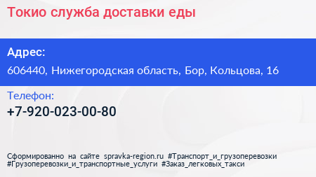 Токио, служба доставки еды по адресу 606440, Нижегородская область, Бор, Кольцова, 16 в дальнейшем Организация, размещена в следующих категориях: