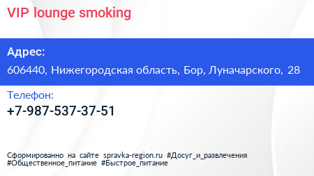 VIP lounge smoking по адресу 606440, Нижегородская область, Бор, Луначарского, 28 в дальнейшем Организация, размещена в следующих категориях: