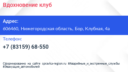 Вдохновение, клуб по адресу 606460, Нижегородская область, Бор, Клубная, 4а в дальнейшем Организация, размещена в следующих категориях:
