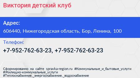 Виктория, детский клуб по адресу 606440, Нижегородская область, Бор, Ленина, 100 в дальнейшем Организация, размещена в следующих категориях:
