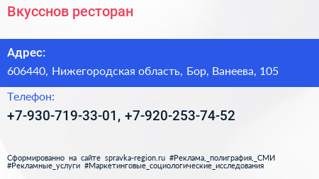 Вкусснов, ресторан по адресу 606440, Нижегородская область, Бор, Ванеева, 105 в дальнейшем Организация, размещена в следующих категориях: