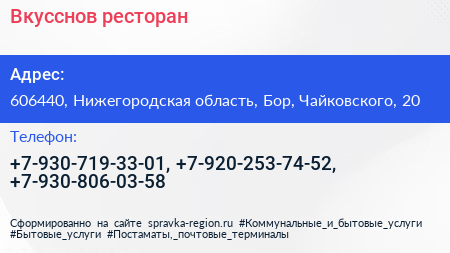 Вкусснов, ресторан по адресу 606440, Нижегородская область, Бор, Чайковского, 20 в дальнейшем Организация, размещена в следующих категориях: