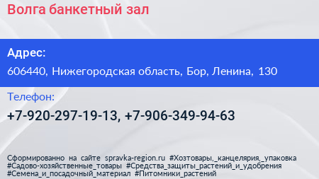 Волга, банкетный зал по адресу 606440, Нижегородская область, Бор, Ленина, 130 в дальнейшем Организация, размещена в следующих категориях: