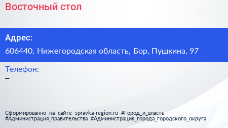 Восточный стол по адресу 606440, Нижегородская область, Бор, Пушкина, 97 в дальнейшем Организация, размещена в следующих категориях: