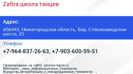 Zafira, школа танцев по адресу 606443, Нижегородская область, Бор, Стеклозаводское шоссе, 25 в дальнейшем Организация, размещена в следующих категориях: