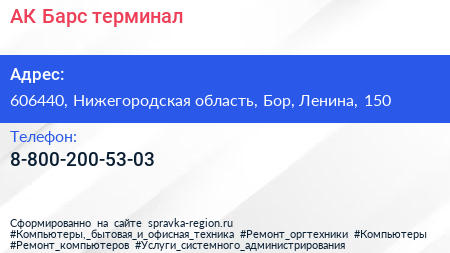АК Барс, терминал по адресу 606440, Нижегородская область, Бор, Ленина, 150 в дальнейшем Организация, размещена в следующих категориях: