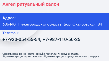 Ангел, ритуальный салон по адресу 606440, Нижегородская область, Бор, Октябрьская, 84 в дальнейшем Организация, размещена в следующих категориях: