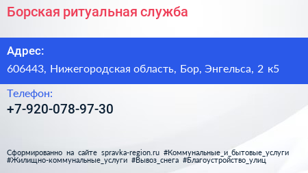 Борская ритуальная служба по адресу 606443, Нижегородская область, Бор, Энгельса, 2 к5 в дальнейшем Организация, размещена в следующих категориях: