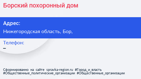 Борский похоронный дом по адресу Нижегородская область, Бор, в дальнейшем Организация, размещена в следующих категориях: