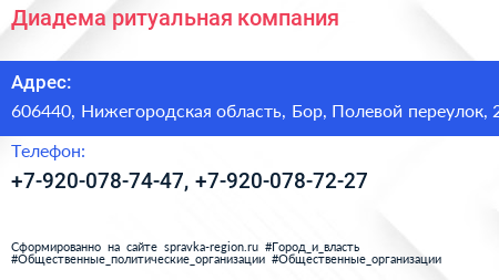Диадема, ритуальная компания по адресу 606440, Нижегородская область, Бор, Полевой переулок, 2 в дальнейшем Организация, размещена в следующих категориях: