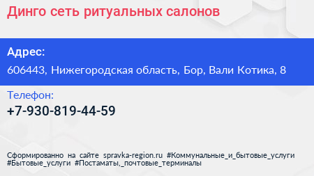 Динго, сеть ритуальных салонов по адресу 606443, Нижегородская область, Бор, Вали Котика, 8 в дальнейшем Организация, размещена в следующих категориях: