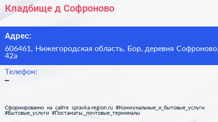 Кладбище, д. Софроново по адресу 606461, Нижегородская область, Бор, деревня Софроново, 42а в дальнейшем Организация, размещена в следующих категориях:
