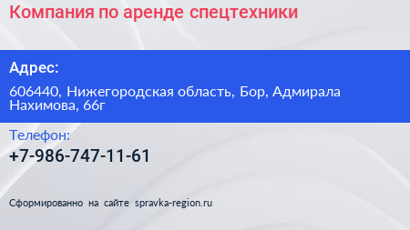 Компания по аренде спецтехники по адресу 606440, Нижегородская область, Бор, Адмирала Нахимова, 66г в дальнейшем Организация, размещена в следующих категориях: