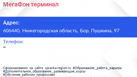 МегаФон, терминал по адресу 606440, Нижегородская область, Бор, Пушкина, 97 в дальнейшем Организация, размещена в следующих категориях: