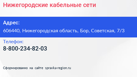 Нижегородские кабельные сети по адресу 606440, Нижегородская область, Бор, Советская, 7/3 в дальнейшем Организация, размещена в следующих категориях:
