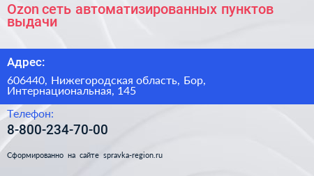 Ozon, сеть автоматизированных пунктов выдачи по адресу 606440, Нижегородская область, Бор, Интернациональная, 145 в дальнейшем Организация, размещена в следующих категориях: