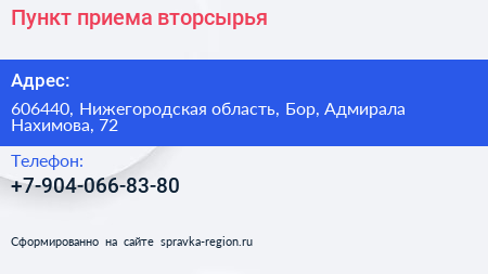 Пункт приема вторсырья по адресу 606440, Нижегородская область, Бор, Адмирала Нахимова, 72 в дальнейшем Организация, размещена в следующих категориях: