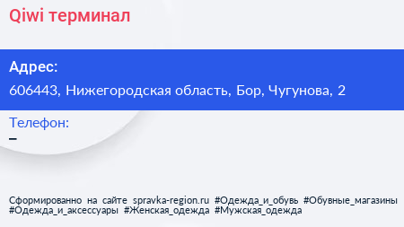 Qiwi, терминал по адресу 606443, Нижегородская область, Бор, Чугунова, 2 в дальнейшем Организация, размещена в следующих категориях: