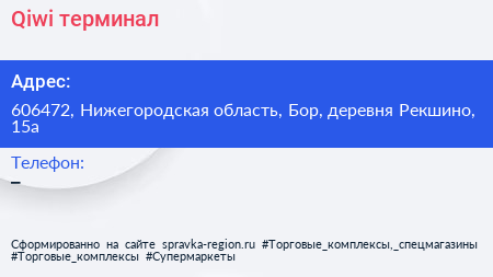 Qiwi, терминал по адресу 606472, Нижегородская область, Бор, деревня Рекшино, 15а в дальнейшем Организация, размещена в следующих категориях: