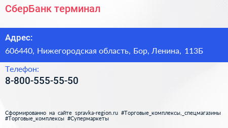 СберБанк, терминал по адресу 606440, Нижегородская область, Бор, Ленина, 113Б в дальнейшем Организация, размещена в следующих категориях: