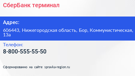 СберБанк, терминал по адресу 606443, Нижегородская область, Бор, Коммунистическая, 13а в дальнейшем Организация, размещена в следующих категориях: