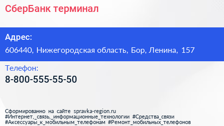 СберБанк, терминал по адресу 606440, Нижегородская область, Бор, Ленина, 157 в дальнейшем Организация, размещена в следующих категориях: