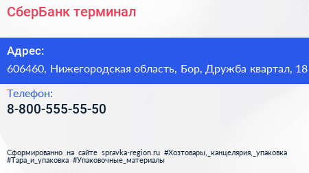 СберБанк, терминал по адресу 606460, Нижегородская область, Бор, Дружба квартал, 18 в дальнейшем Организация, размещена в следующих категориях: